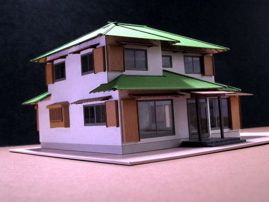 木造2階建て寄棟屋根。 和風です。日本霧除けで、垂木も入って超細かいです。
